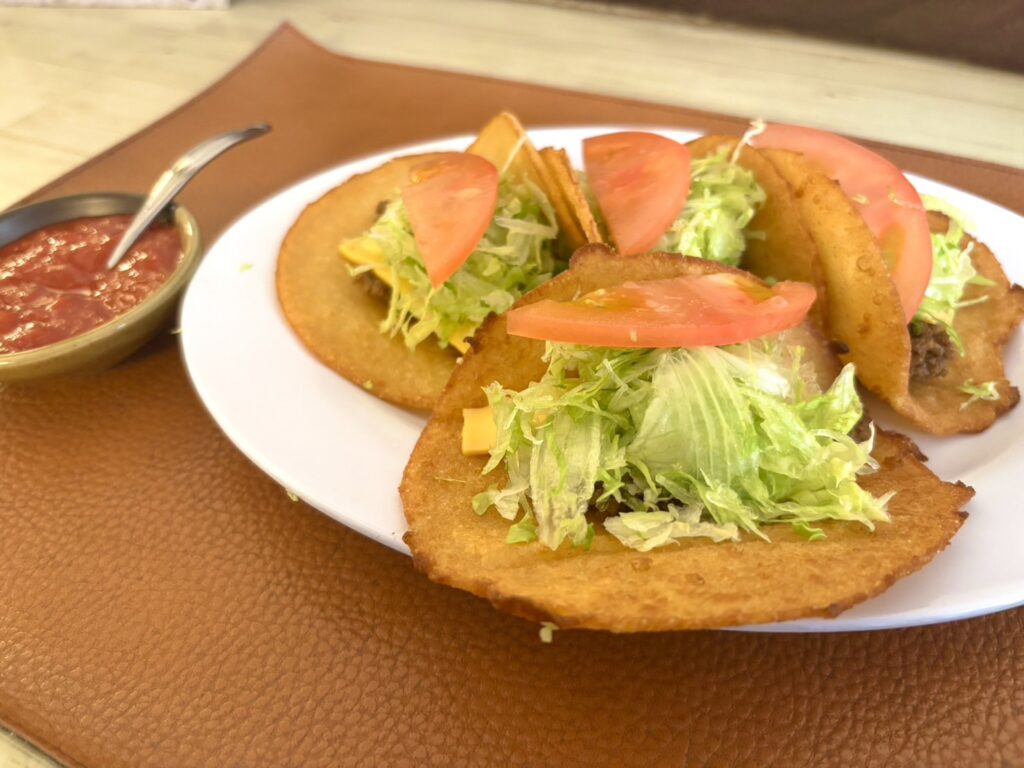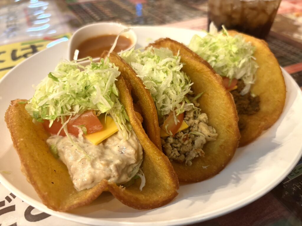 お目当てのタコスは一見、本場メキシカンスタイルかと思いきや、トルティーヤは薄揚げした沖縄スタイル。