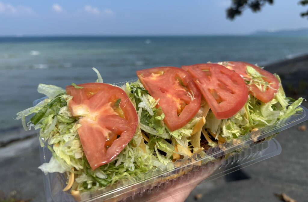 味付けはパンチの効いた濃いめで、トマトとレタスがほどよく全体をまとめますが、挽き肉とチェダーチーズの濃厚な味わいが主役としてしっかり存在感を放っています。