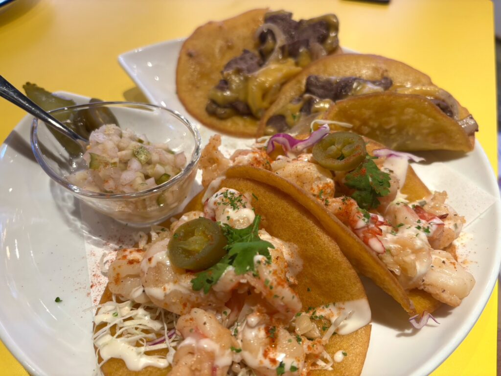 店主のイチオシはガーリックシュリンプタコス(手前)とチーズステーキタコス(奥)